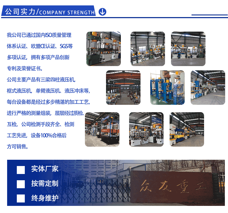 滕州眾友重工機(jī)械設(shè)備有限公司是我國油壓機(jī)、壓力機(jī)專業(yè)生產(chǎn)企業(yè)之一, 公司擁有大型落地鏜銑床、重型車床、銑床刨床等設(shè)備,工藝裝備先進(jìn),專業(yè)生產(chǎn)常規(guī)油壓機(jī)、四柱油壓機(jī)、小型油壓機(jī)、單臂油壓機(jī)、多功能油壓機(jī)、框式油壓機(jī)、龍門油壓機(jī)、臥式油壓機(jī)、三梁四柱油壓機(jī)各類油壓機(jī)及汽保設(shè)備。公司與多家國有大型企業(yè)、獨(dú)資合資及民營企業(yè)服務(wù)配套數(shù)十臺,深受用戶歡迎